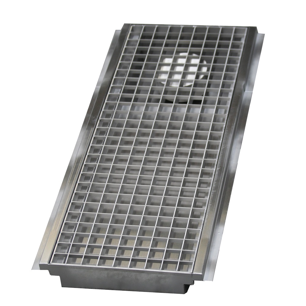 Ce caniveau de sol à la structure soudée et décapée est réalisé en acier inox 18/10 AISI 304/441 finition brossée et polie avec cloche anti-odeur amovible diamètre 128mm, évacuation diamètre 75mm verticale ou horizontale et grilles en inox 304 avec mailles de 33x33 faites en barres 2mm sur une hauteur de 30mm de type CAILLEBOTIS.