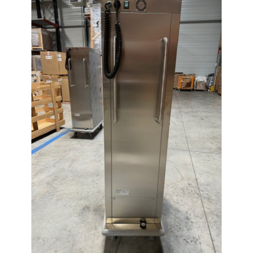Chariot chaud de liaison  emboutis 20 GN1/1 au pas de 70mm- Dim:530x830x1800 mm - 1 porte - Inox AISI 18/8 avec structure et composants renforcés - Panneau de commande intégré - Thermostat numérique pour la régulation de la température (60-100°C) et l'humidité par différents niveaux (5 niveaux de 30 à 50%) - Porte avec ouverture 270° et système de verrouillage - Serrure à clé - Protection contre les chocs -  Prise électrique à l'arrière - Clayettes non incluses - Puissance : 2100 w