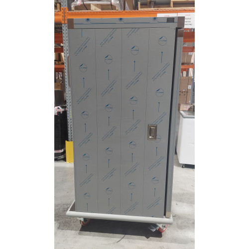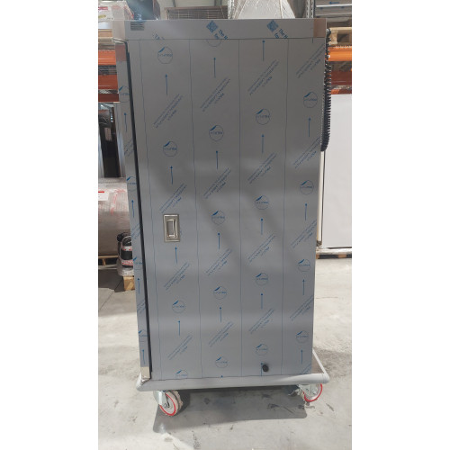 Chariot chaud 20 GN2/1 au pas de 70mm - Dim:730x950x1800 mm - 1 porte - Inox AISI 18/8 avec structure et composants renforcés - Panneau de commande intégré - Thermostat numérique pour la régulation de la température (60-100°C) et l'humidité par différents niveaux (5 niveaux de 30 à 50%) - Porte avec ouverture 270° et système de verrouillage - Serrure à clé - Protection contre les chocs - Prise électrique à l'arrière - Clayettes non incluses - Puissance : 2100 w