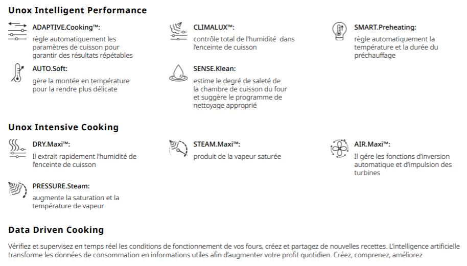 Ainsi vous découvrirez les fontions ADAPTAVIE.Cooking qui règle automatiquement les paramètres de cuisson pour garantir des résultats reproductible, SMART.Preheating qui règle automatiquement la température et la durée du préchauffage, mais aussi l'AUTO.SOFT qui va gérer l'ascension thermique qui rendra la montée en température plus délicate.