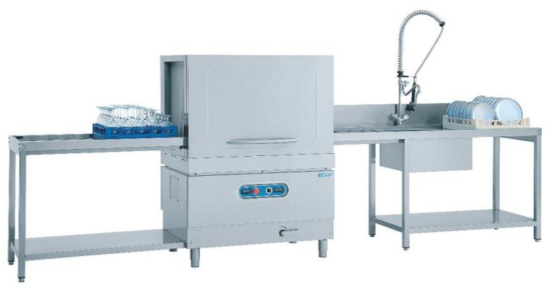 Ce lave vaisselle à avancement automatique peut-être complété d’une zone de séchage, de tables de service, d'une hotte d’extraction de buées et d'une pompe à chaleur proposés en options.