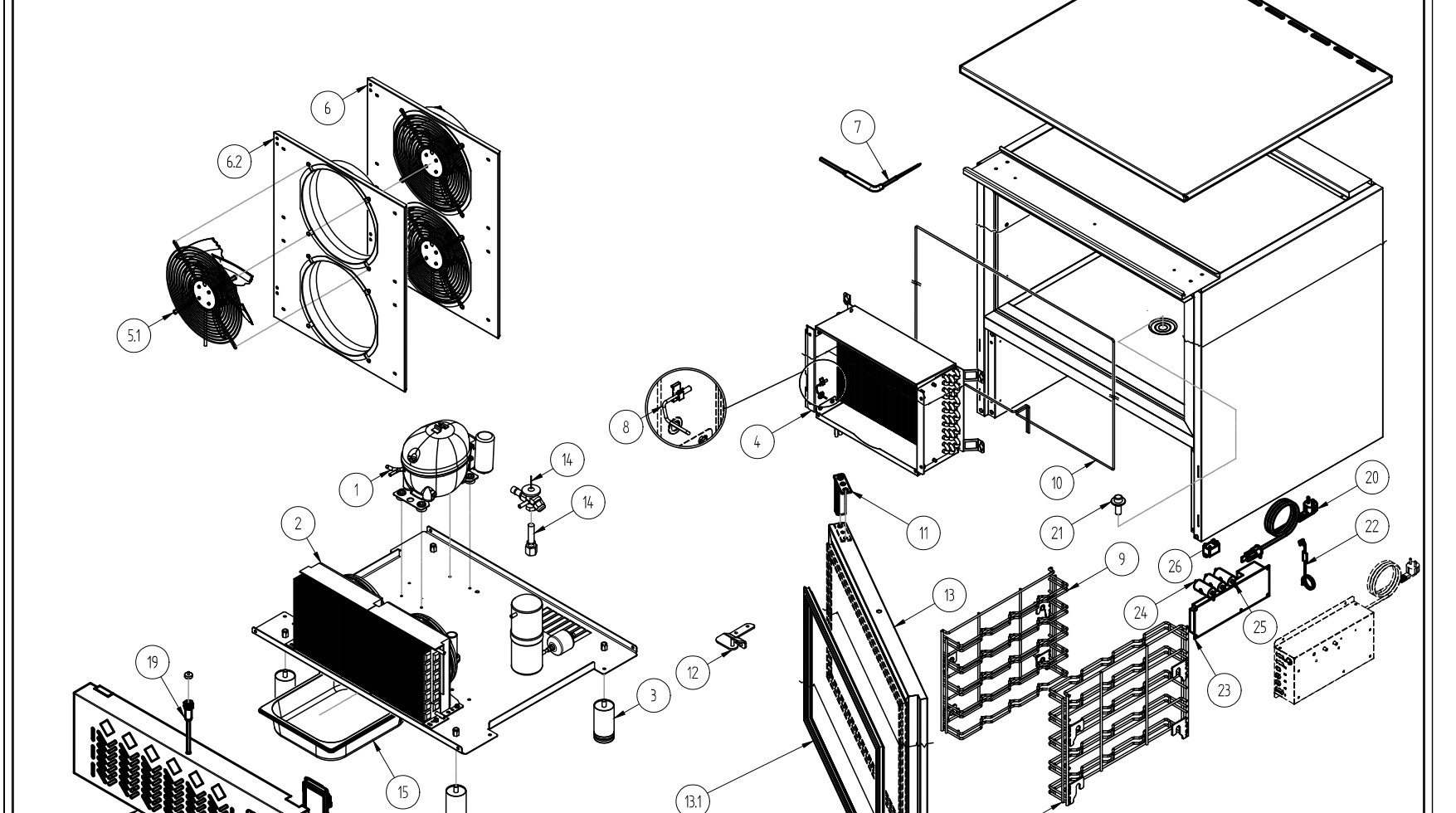 Thermostat de travail, thermostat de sécurité, sonde,compresseur, évaporateur, condenseur, gicleurs d'eau,ventilateur, composantes électriques........