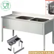 Elle possède deux bacs de 400x500xh275mm, un fond extérieur de la cuve revêtu d’un isolant phonique, crépine et bonde de trop-plein et des verins en inox réglables.