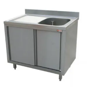 Cette plonge sur armoire avec portes coulissantes à double paroi entièrement réalisée en acier inox 18/10 AISI 304/441 est dotée d'un plan supérieur embouti avec dosseret arrière de 85mm.