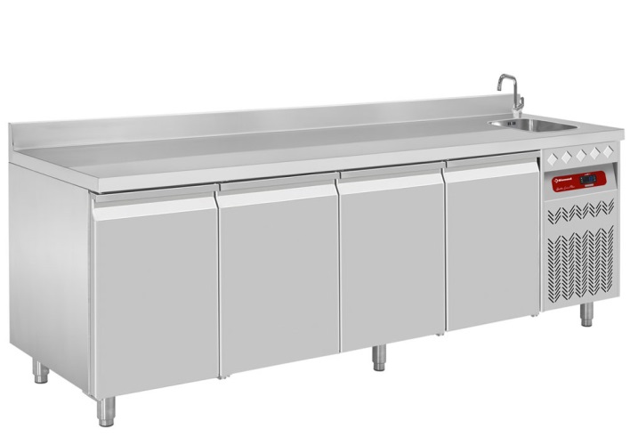 Portes avec poignée ergonomique (non saillante) et réversible (pas de nécessité d'un kit), fermeture assurée par joint magnétique "à pression" (remplacement aisé sans outillage), charnières avec arrêt à 100° et fermeture portes avec rappel automatique.